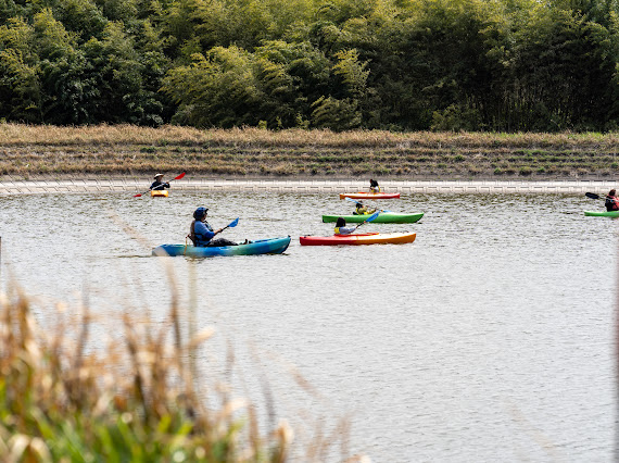 (広々としたため池でカヌー体験の様子。)
